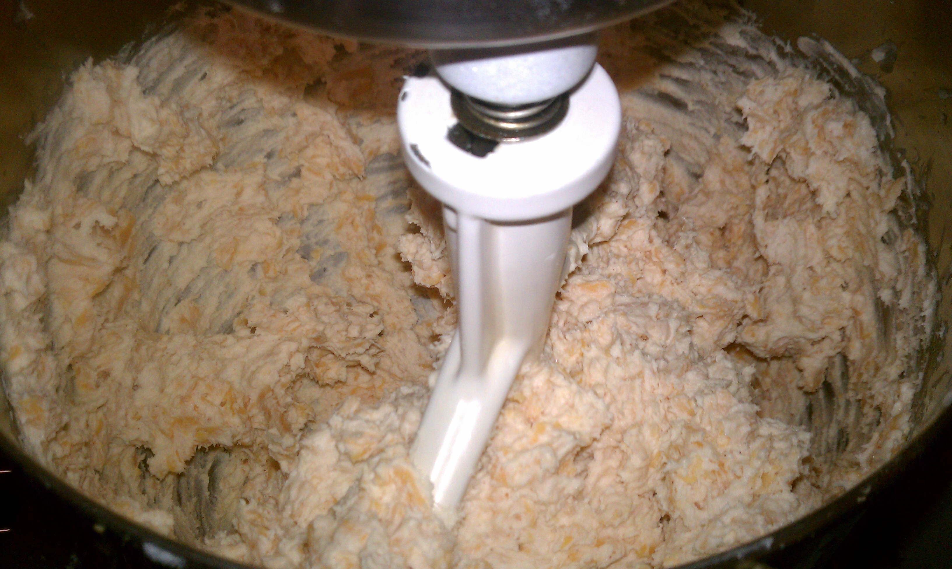Cream Butter in mixer then add all the dry ingredients into the butter and cream it together.  Add the cheese and blend with butter/flour mixture.