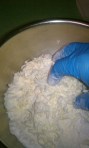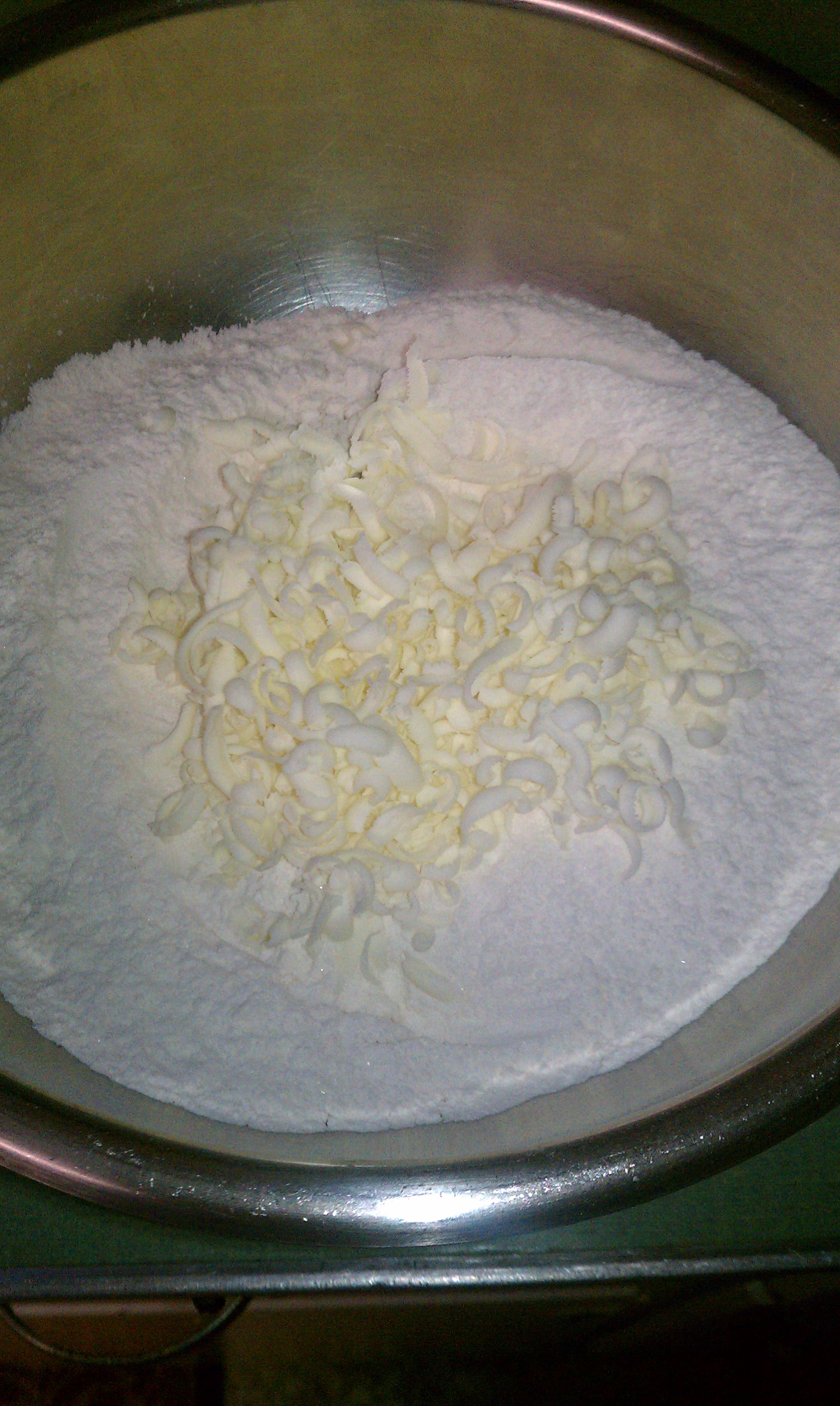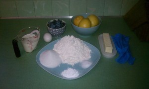 Combine all the dry ingredients in a mixing bowl (stir with a fork to combine). Using the exam gloves to lessen the heat from your hands warming the butter, grate the frozen butter into the flour tossing the grated butter into the flour often so it does not stick together in a large clump, you will have to work quickly before the butter softens. Zest one lemon and toss into the flour.