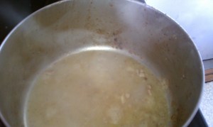 In a large stock pot put a few tablespoons of olive oil and heat. Once hot toss in the onions, corn (and scrapings) and peppers to saute till onions are translucent. Toss in the garlic and allow to cook till SLIGHTLY brown~don’t allow to burn. Remove the onions, peppers and garlic.