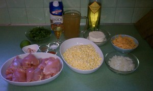 Cube boneless chicken and liberally salt and pepper set aside. Dice the onion, divide peppers into quarters from pole to pole removing the seeds (and white spines if you don’t want the soup too spicy) julianne the peppers, finely mince the garlic. Cut the fresh corn from the cob and scrape the cobs with the back side of a knife to clean out any thing left on the cob.