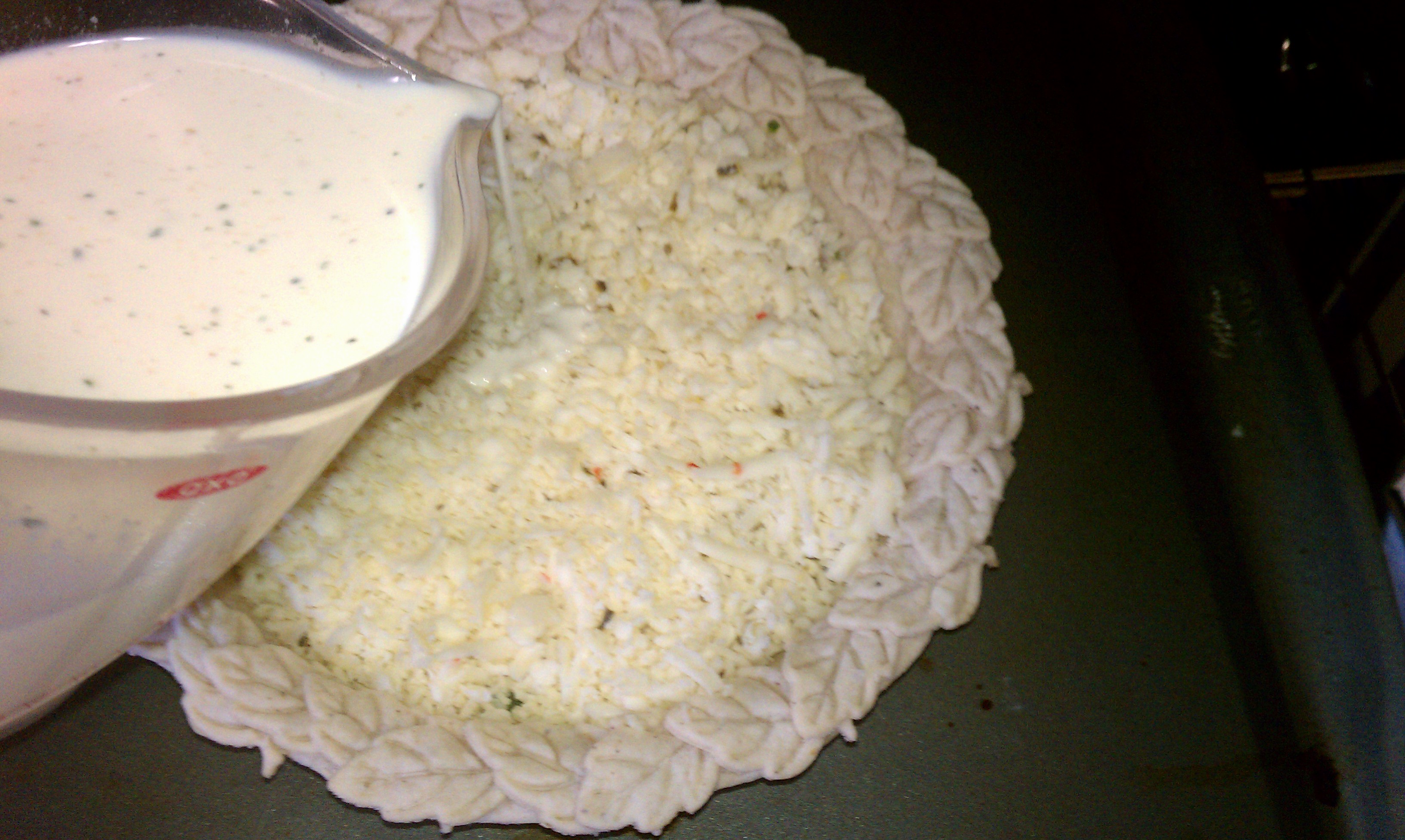 Pour the egg mixture over the cheese slowly, it may not all fit depending on the depth of your pie pan. By pouring the egg mixture into the pie crust while on the cookies sheet in the oven you reduce the risk of spilling the pie as you place it in the oven (…not that *I* would know anything about spilling).