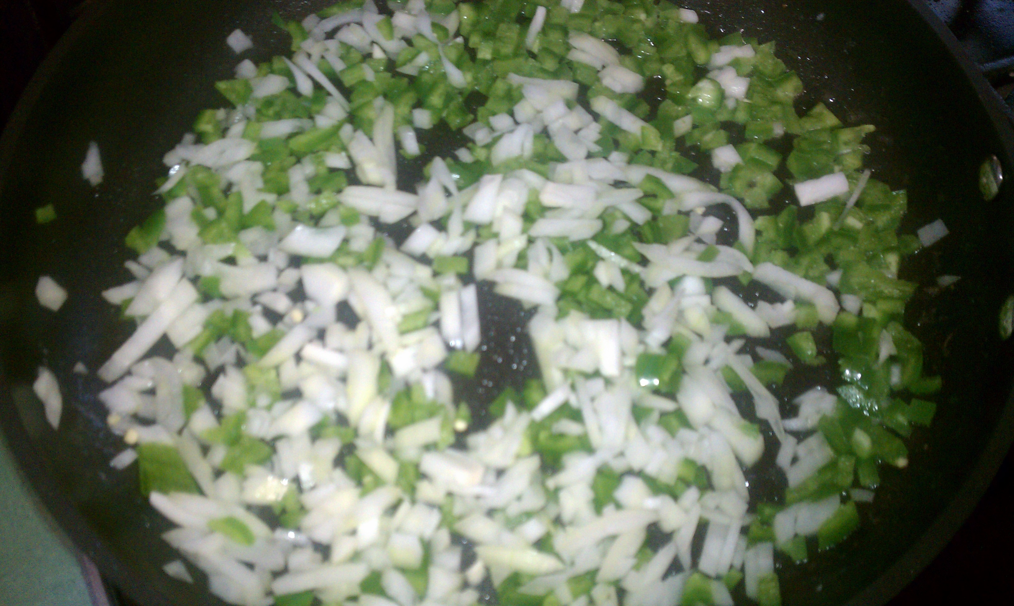 There should be no color on either the peppers or onions.