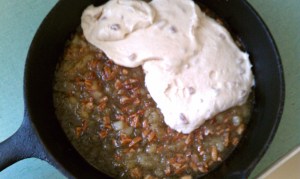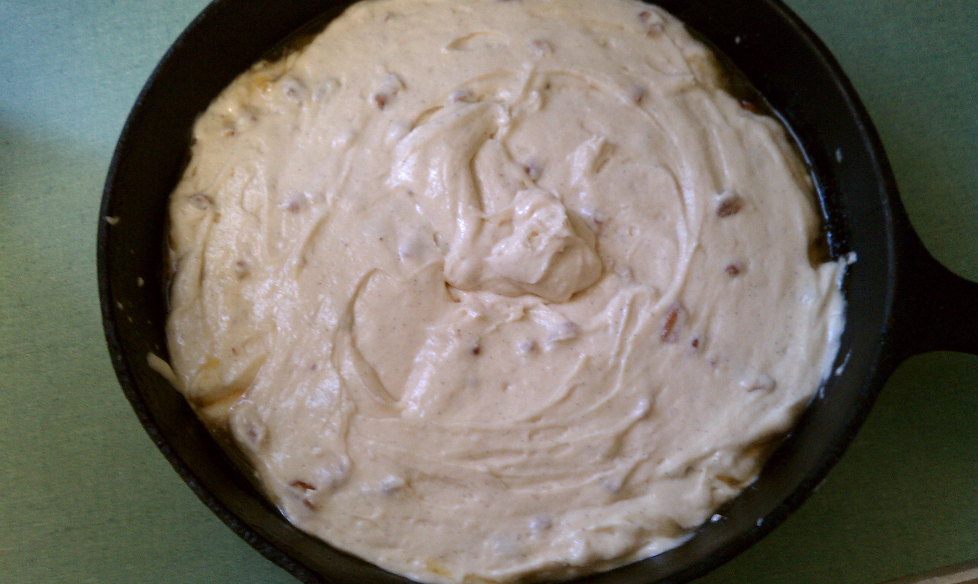 With a spatula carefully drop small dollops of batter into your backing dish covering the brown sugar/pineapple in the bottom of the pan, smooth out evenly baking at 350 for approx 40 minutes.