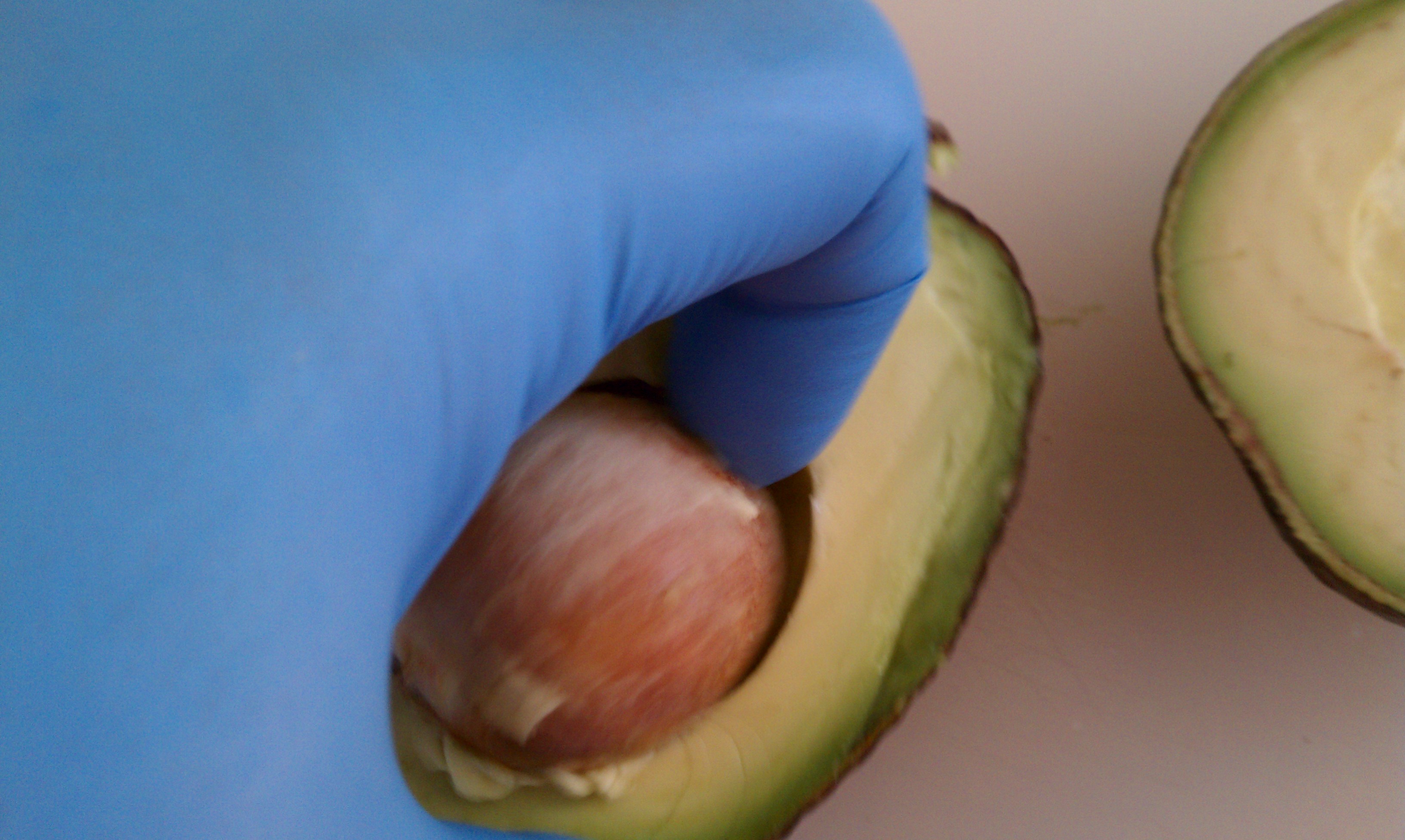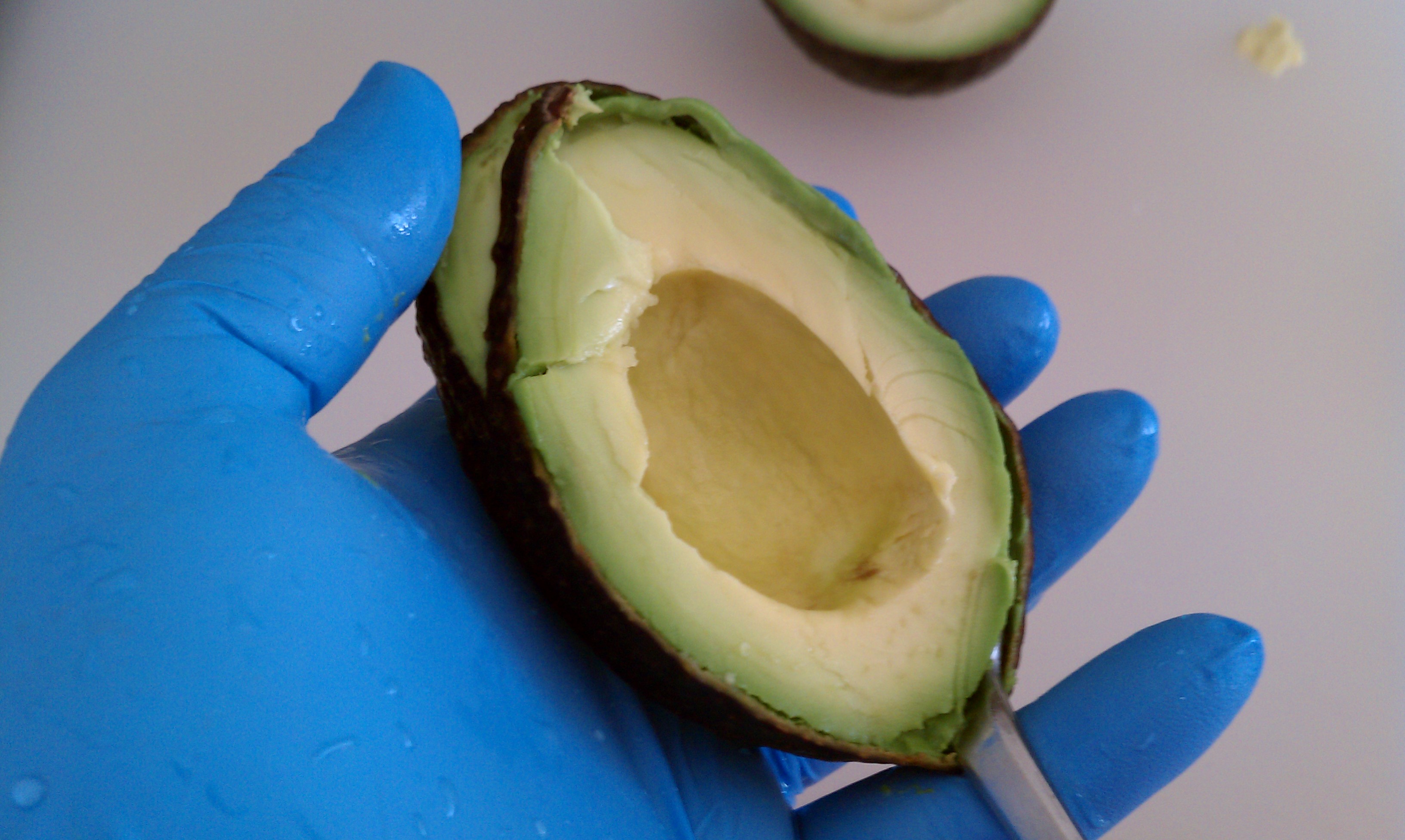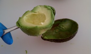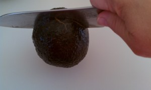 Cut the avocado in half by cutting into it from pole to pole rolling the avocado as you cut, this will slice it in half with little chance of cutting yourself. Pop the avocado apart and using your FINGERS remove the pit like so…