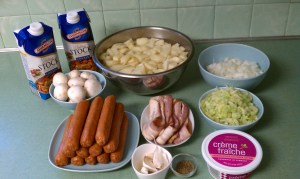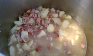 OK toss your bacon into a large stock pot and render down remove to a paper towel to drain. In the same pot toss in the onions, celery, mushrooms allow to sweat down until onions are translucent then add in the finely minced garlic and pepper, allow the onions to get a little color then toss in the white wine and reduce by half if you are using it to deglaze the pan if not use some of the stock. Add back in the bacon as well as the sausage and potatoes along with the remaining stock.