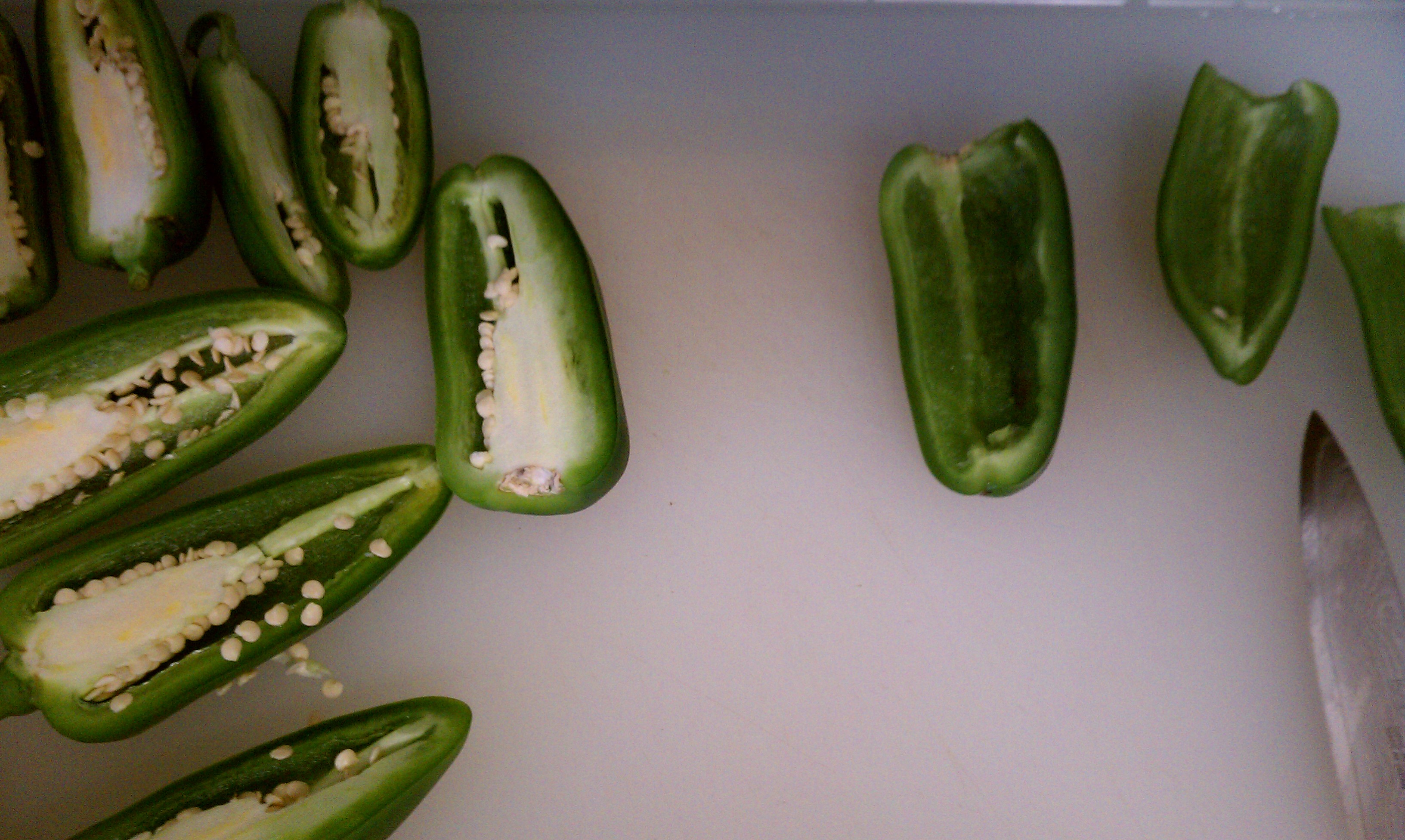 Dawn you gloves and slice each jalapeno from north to south pole, remove all the seeds and white membrane as that is where the heat is if you like them hotter just pop out the large pod of seeds and leave the remaining seeds.
