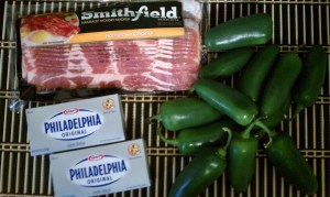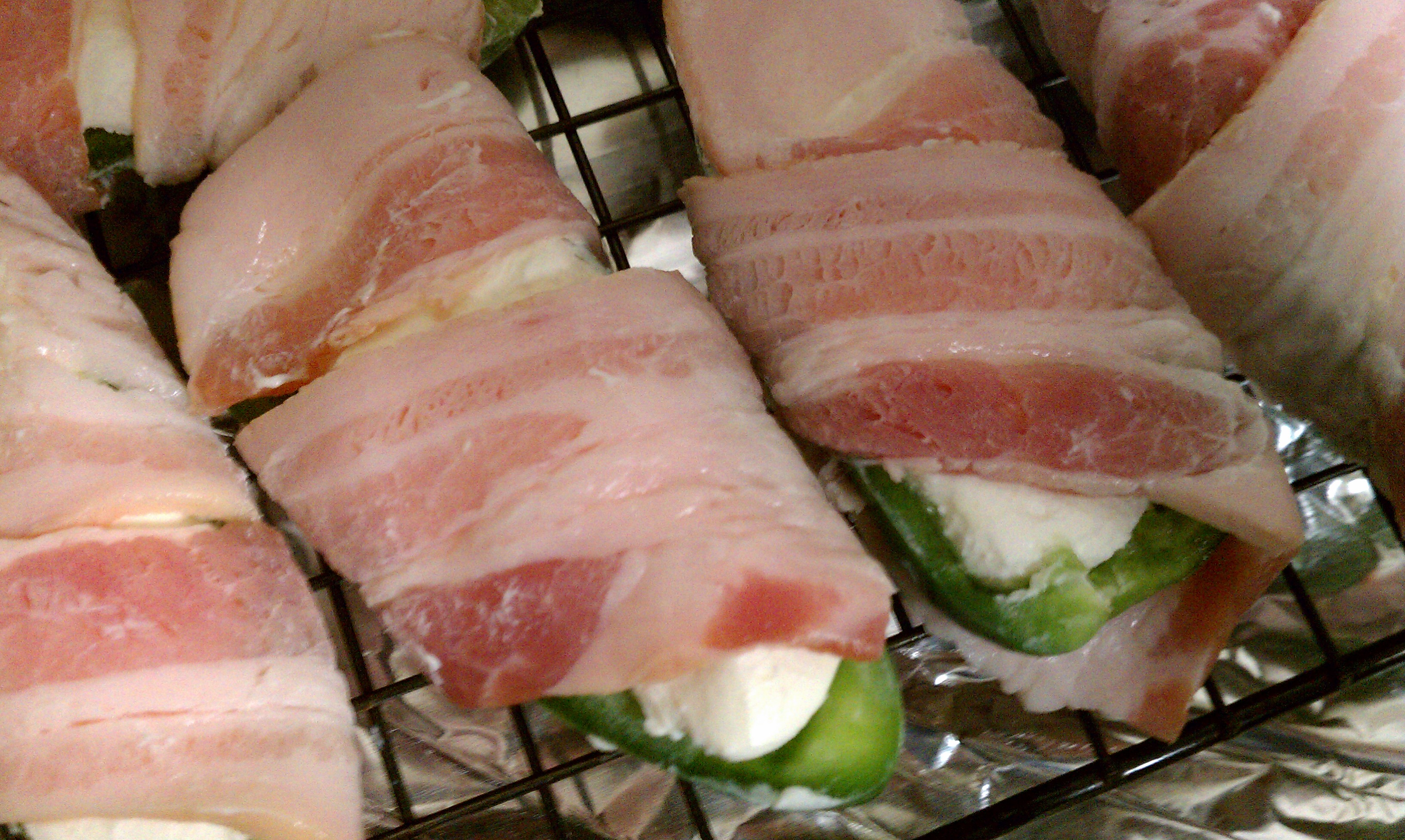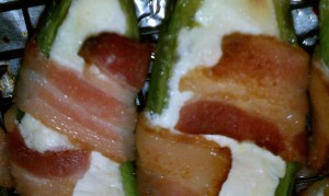 Stuff with cream cheese level with the top of the pepper. Cut your bacon in half and use one piece of bacon to wrap around the stuffed peppers. Now you can spear them with a toothpick but I don’t bother I just wrap the bacon around the pepper and toss in the oven at about 45 minutes or until the jalapenos are not crisp any more but the bacon is at the crispness you like.