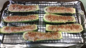 Fill all of your zucchini boats with the crab mixture mounding slightly. Top with the browned panko crumbs. I use a cooling rack to keep them out of any juices that may cook out just to keep the zucchini from getting to waterlogged and mushy. Bake at 400 for about 45 minutes. You will want them to still be slightly firm when you remove them from the oven. Mushy overcooked zucchini will start falling apart on you.