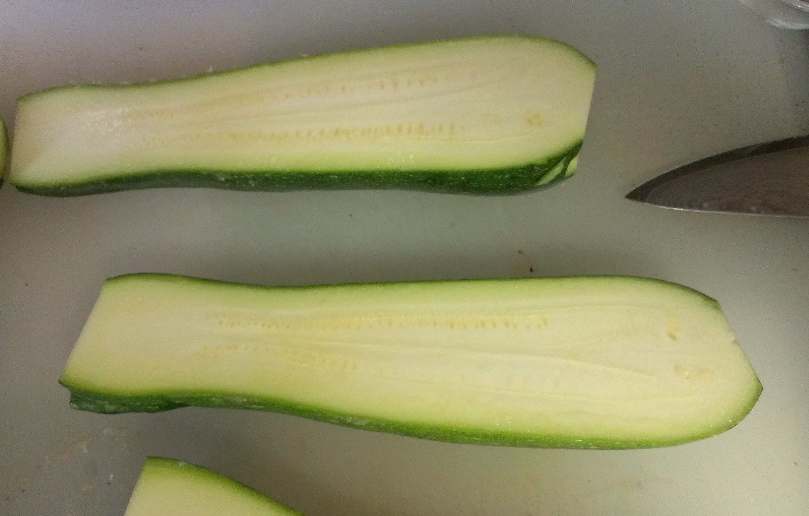 Slice the zucchini length wise and remove seeds with a mellon baller or spoon. You will want to leave about 1/3 of the flesh when you remove the seeds…think canoe shaped.