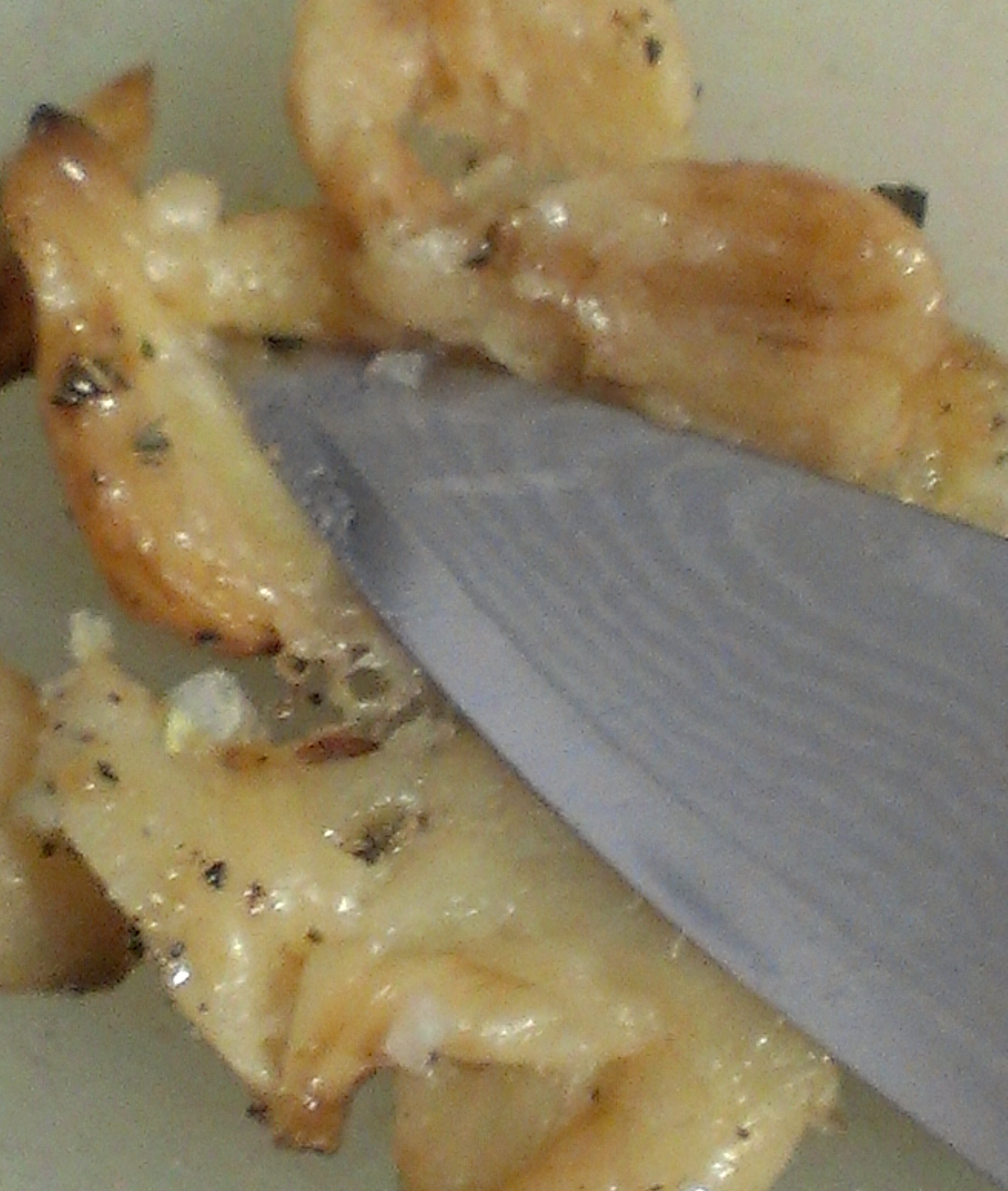 With the side of a knife and a good amount of pressure you are going to mashed the roasted garlic into a pulp. Just take your knife with a firm grip on the handle and with the fingers of your other hand pressing on the flat of the blade and stroke though the garlic as if you were using a pain roller sweeping toward yourself and the sharp edge of the blade away from you. Then pick it up and stroke though it t will need to scrap the pulp back together after a few strokes. Just keep pulling the knife through the garlic until is mashed into oblivion.