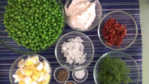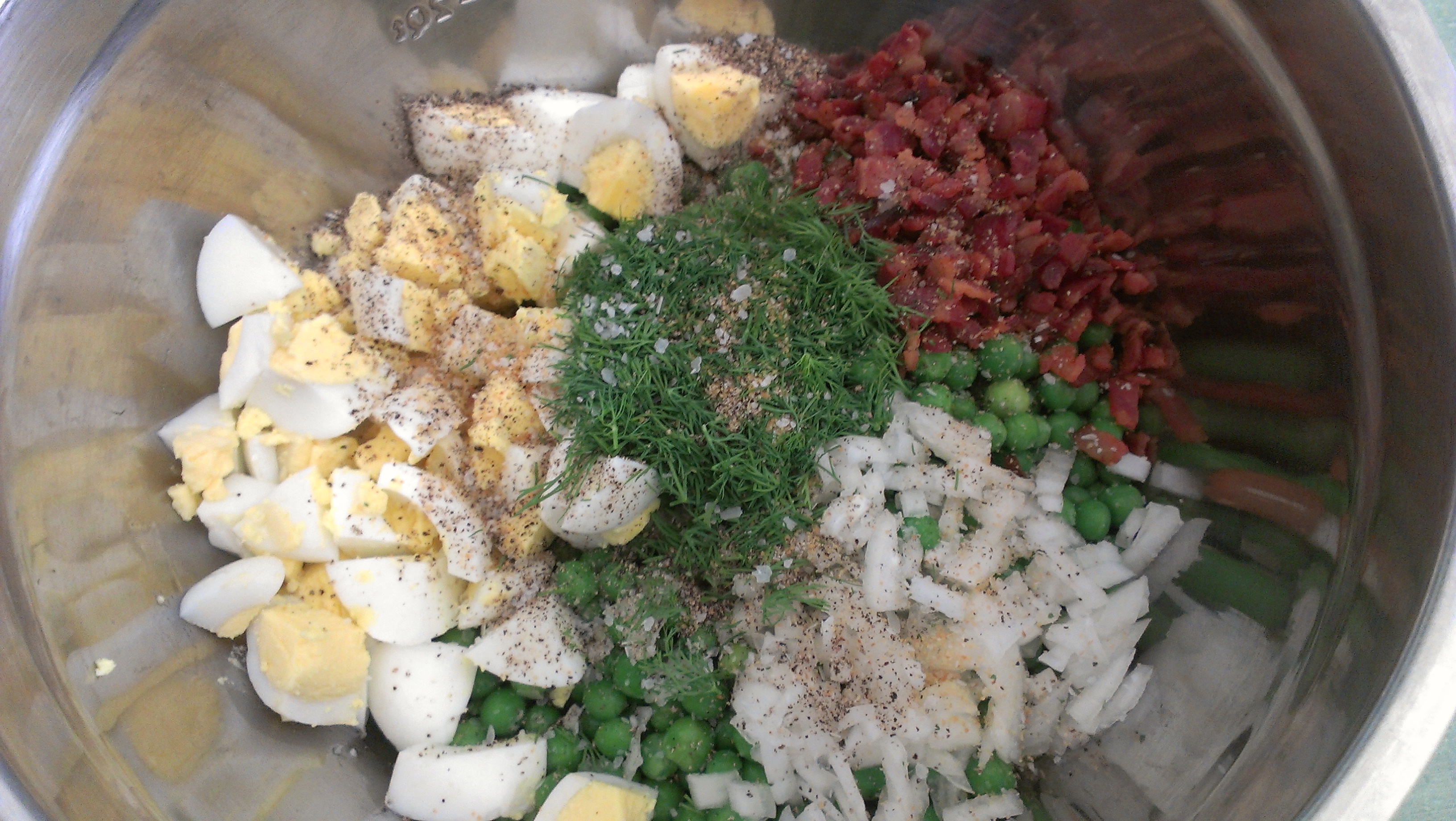 Rinse thawed peas and toss into a large mixing bowl add in the bacon, onions, dill, eggs, salt, pepper, garlic and mayo, stir well and chill for a few hours.