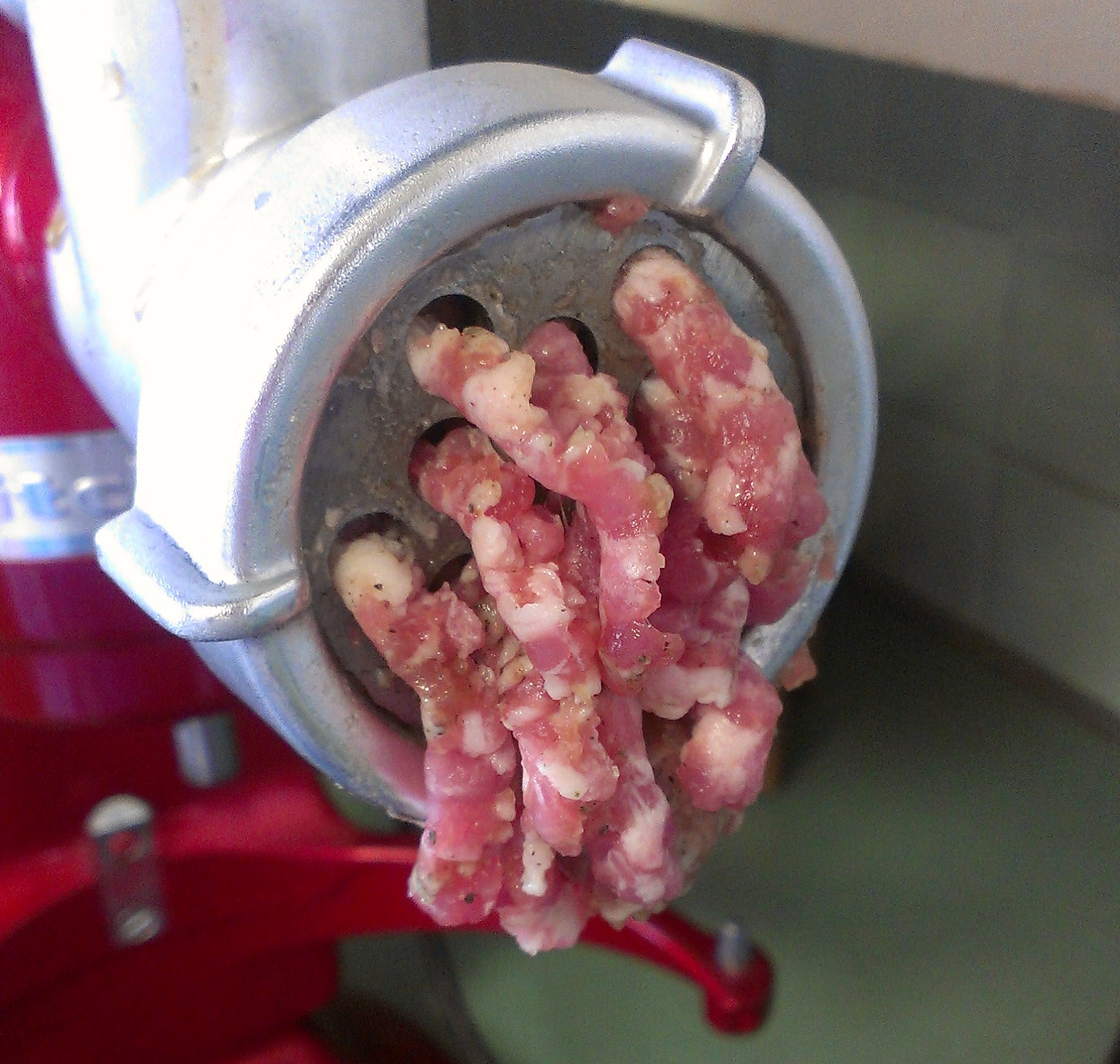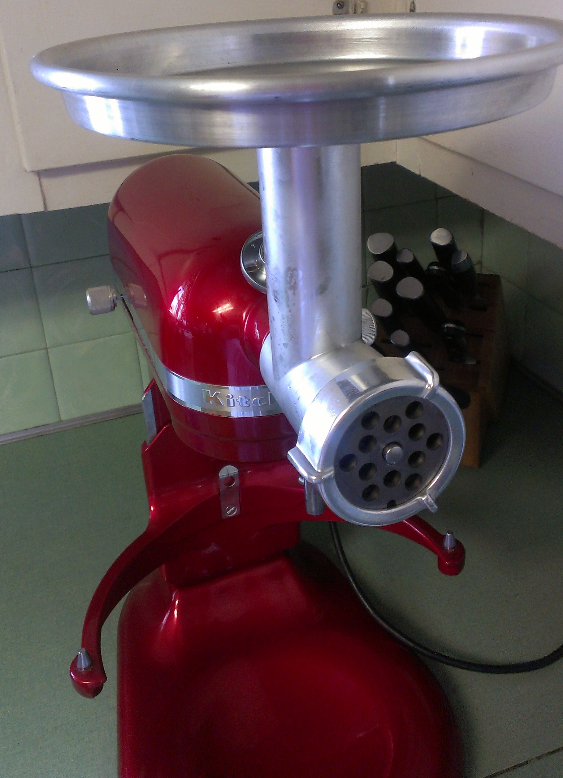 So because I can not leave well enough alone off I went to Amazon.com to find a meat grinder for the work horse KA The Daughter gave me for Mother’s Day (What?!? You haven’t seen it yet well you just hold on…). I found two types which would work for the KA -a mainly plastic one produced by KA and an aluminum one produced to work with a KA from Chef’s Choice. There is about $100 difference in cost but because I know how hard I am on my cooking tools I knew I would need the strength of the Chef’s Choice. Into the basket and off to the check out…This thing is a marvel to behold as you press those chunks of protein down into the grinder only to see long strands emerging from the cutting die…oh happy joy! Lovely uniform strands falling away…finely marbled bits…fresh smelling spices wafting up…the whirl of the machine as it pumps out that which soon will be gobbled up. Yes you are right I am becoming obsessed with what I can stuff through those grinding plates!