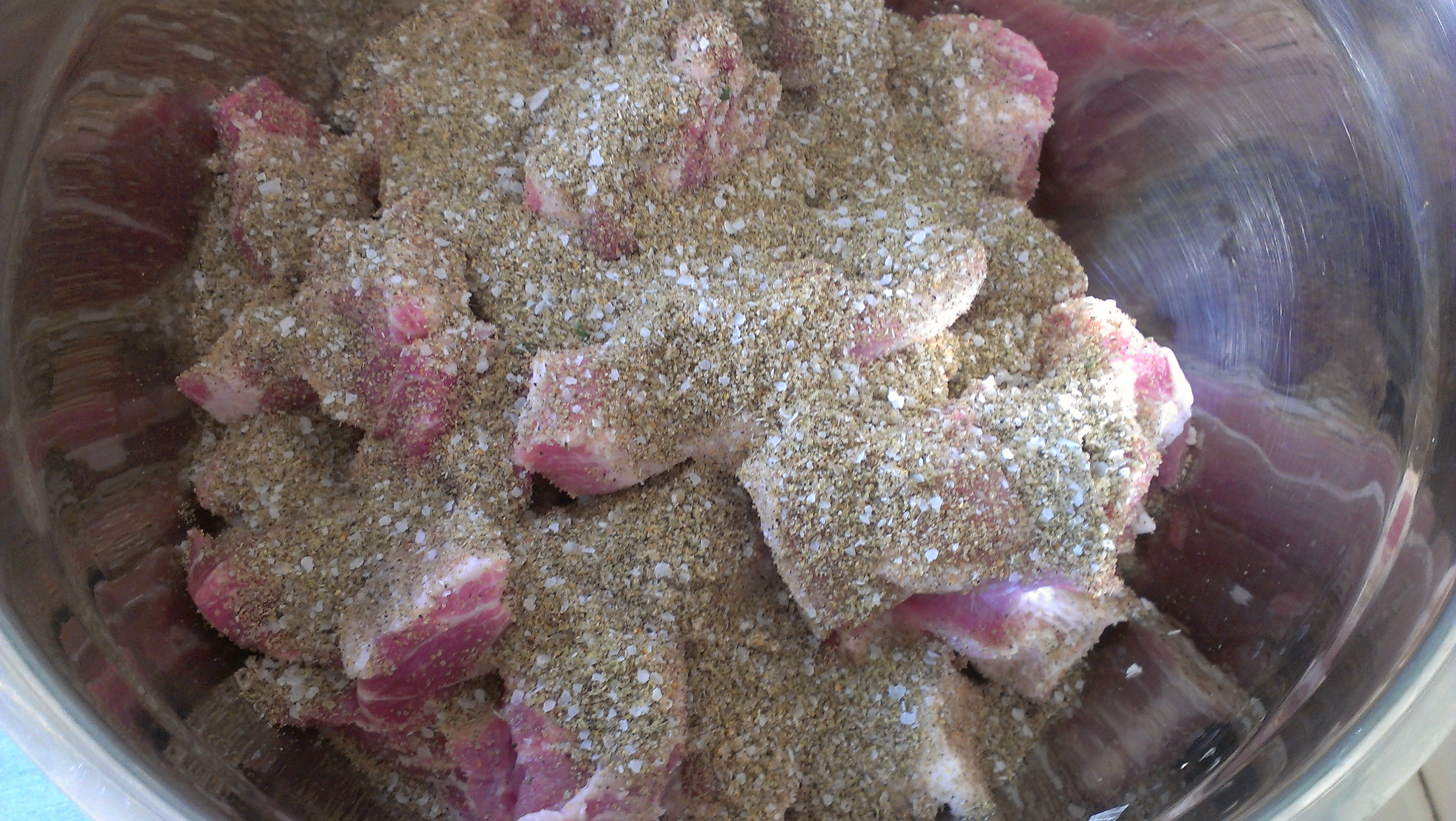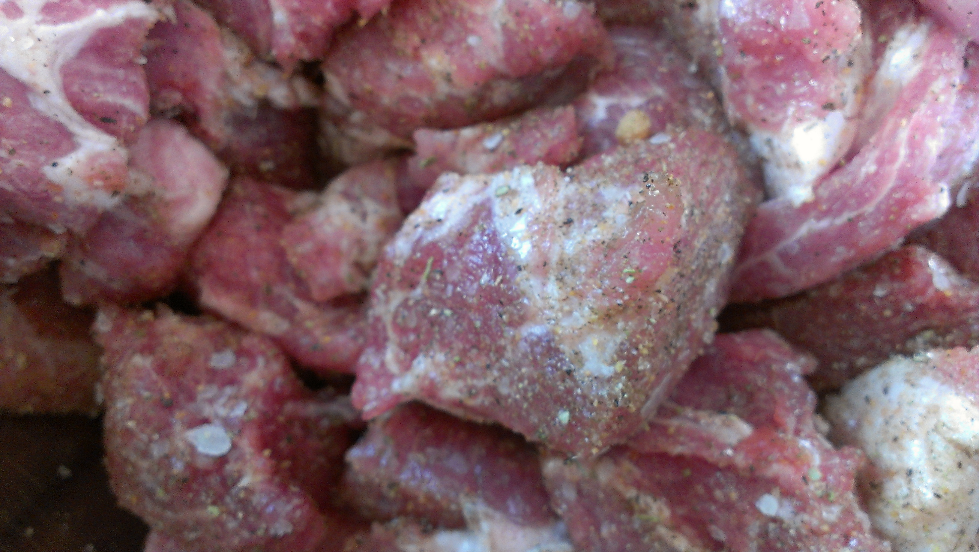 Combine all the dry ingredients well and toss the cubed meat with the mixture.