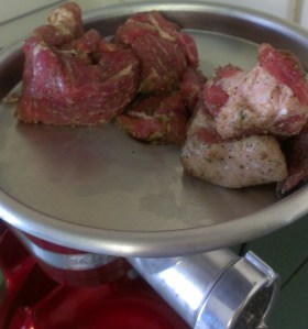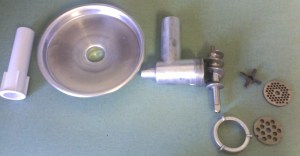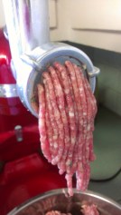OK starting with the larger grinding plate provided with your grinder its into the hopper with the chunks of meat, using the provided plunger use a steady pressure to move the meat thought the feeding tube…DO NOT used your fingers to press the meat from the feed tube into the worm drive unless you really don’t like them.