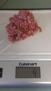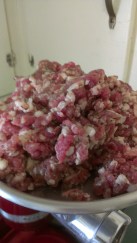 ****The night before put your grinding attachment into the fridge to help with keeping the meat from warming to quickly while grinding. Also make sure everything is spotlessly clean while working with this recipe. I strongly suggest using exam gloves while working with the meat. Ground meat is one of the easiest ways of passing along bacteria so be your toes with your hand washing and cleaning of any bowls, cutting boards, knives or storage vessels you are using. If you will be storing in zip-locks pass up your previously used zip-locks and go for a new one just to be safe.